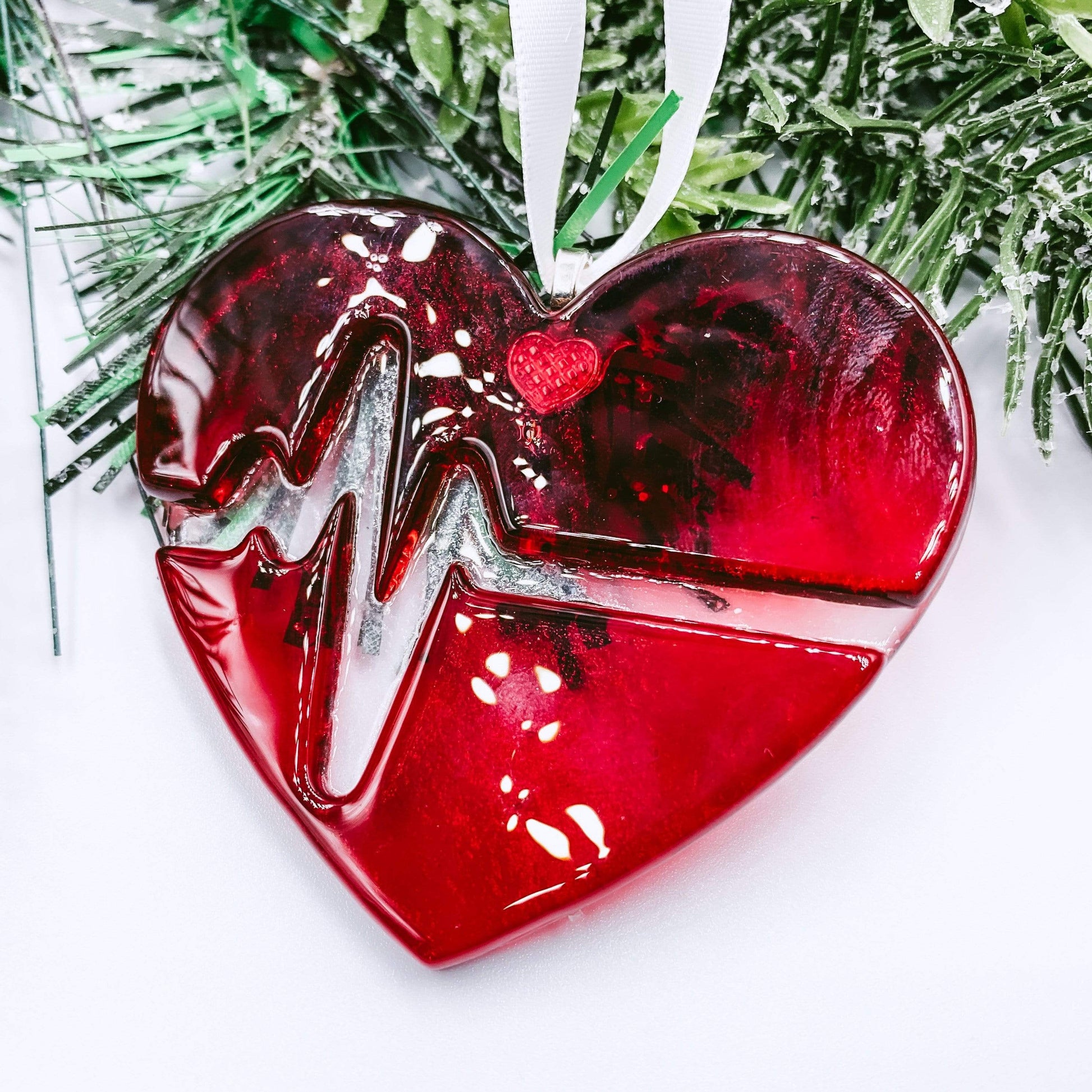This is a beautiful Fused Glass Heart Beat Ornament. It is perfect as a special nurse gift, doctor gift or maybe a donor gift. It is made with a lot of love and beautiful Red Transparent Glass. It was cut and "cooked" in my own little home studio. It was annealled to give it strength and then I added a Silver Bail and a colorful ribbon. This little treasure is sure to find a spot on someone's Christmas Tree, in their window as a suncatcher, hanging in their Car from their Rear View Mirror, or maybe in their office. It is sure to find that special place to bring some sunshine into their lives.