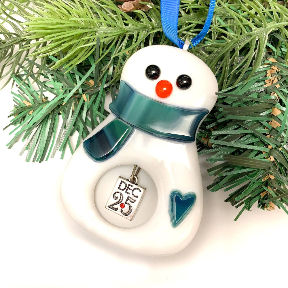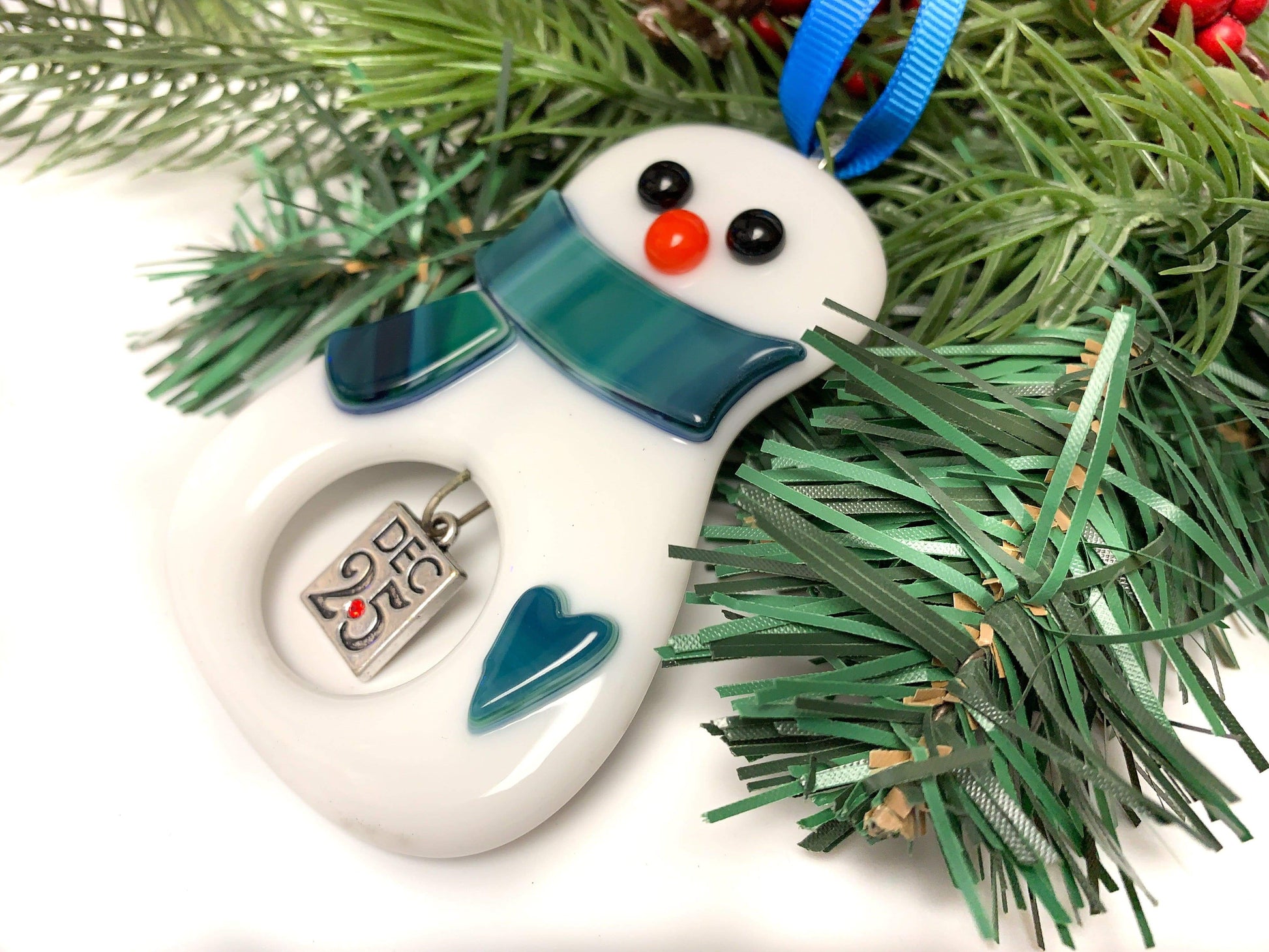 This is a fused glass snowman ornament with his customizable charm. His little snowman body is made with two layers of glass fused together and then a jewelry bail was added for his ribbon to fasten on your Christmas Tree. This chubby snowman's striped scarf is made of a special glass as well as his little heart. His itty-bitty eyes, nose, and star were layered on top and fused again in my home studio kiln. The glass in this Christmas Ornament has been annealed properly in the kiln to guarantee strength and durability.